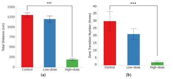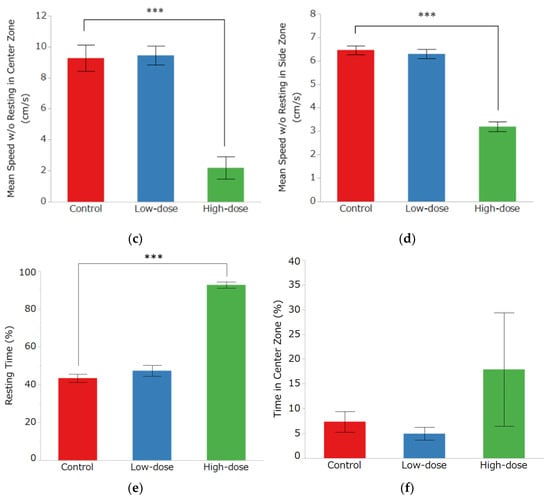 The OF results are shown in Figure 5. In the OF group, there was a significant decrease in the distance traveled from 1304 ± 55 cm in the control group and 1202 ± 77 cm in the low-dose group to 195 ± 24 cm in the high-dose group (Figure 5a, p < 0.0001). The number of area movements was 30 ± 7 times in the control group, 21 ± 4 times in the low-dose group, and 2 ± 1 times in the high-dose group, with a significant decrease in the high-dose group (Figure 5b, p = 0.0004). In the center area, the mean movement speed was 9.27 ± 0.86 cm/s in the control group, 9.45 ± 0.61 cm/s in the low-dose group, and 2.19 ± 0.72 cm/s in the high-dose group. In the side area, the mean movement speed was 6.46 ± 0.19 cm/s in the control group, 6.29 ± 0.20 cm/s in the low-dose group, and 3.20 ± 0.20 cm/s in the high-dose group; in both areas, there was a significant decrease in mean movement speed in the high-dose group (Figure 5c,d, p < 0.0001). The resting time was 43.4 ± 2.22% in the control group, 47.30 ± 2.93% in the low-dose group, and 92.67 ± 1.60% in the high-dose group, with a significant increase in the high-dose group (Figure 5e, p < 0.0001). Although the average time spent in the center area was higher in the high-dose group (17.91 ± 11.45%) than in the control group (7.38 ± 2.09%) and low-dose group (4.96 ± 1.31%), the differences were not statistically significant (Figure 5f).