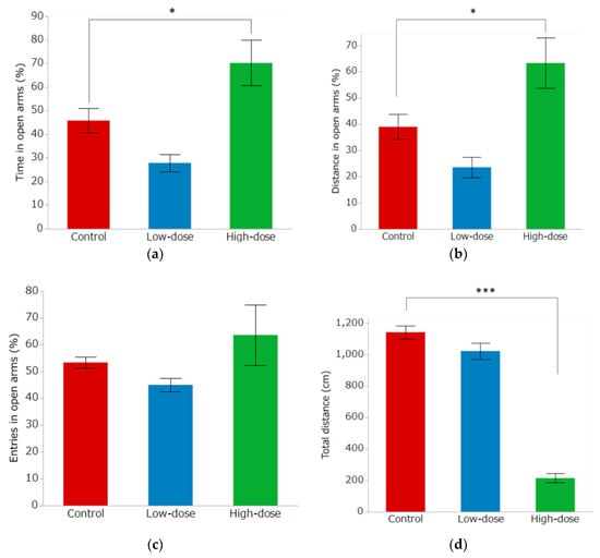 The EPM results are shown in Figure 6. The percentage of time spent in the open arm was 45.80 ± 5.24% in the control group, 27.86 ± 3.68% in the low-dose group, and 70.20 ± 9.60% in the high-dose group, and the percentage of distance spent in open arms was 38.95 ± 4.76%, 23.56 ± 3.85% and 63.25 ± 9.62%, in the control group, low-dose group, high-dose group, respectively. For these parameters, there was a significant increase in the high-dose group compared to the control group (Figure 6a,b, p < 0.05). In contrast, the percentages of open arm entries were 53.27 ± 2.09% in the control group, 44.93 ± 2.48% in the low-dose group, and 63.52 ± 11.31% in the high-dose group, which were not significantly different (Figure 6c). The total distance traveled in the control, low-dose and high-dose group was 1140.7 ± 41.08 cm, 1021.7 ± 51.91 cm and 214.1 ± 28.49 cm, respectively, was significantly less in the high-dose group than in the control group (Figure 6d, p < 0.0001).