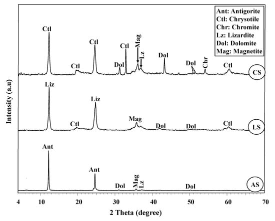 - Inspected serpentinite rocks (AS, LS, and CS) revealed variations in the mineralogical, geochemical, and morphological properties. More specifically, the AS sample is mainly composed of antigorite mineral with high SiO2 and Fe2O3%, while lizardite and chrysotile are the principal minerals of the LS and CS samples, respectively, with lower SiO2 and Fe2O3%. Magnetite and dolomite are the dominant associating minerals in these samples but in different magnitudes. As for the morphological features, AS sample had a sub-rectangular shape with a rough surface, while LS sample had a platy shape with rough morphology, and the CS sample possessed splintery and fibrous bundles with a smooth surface.