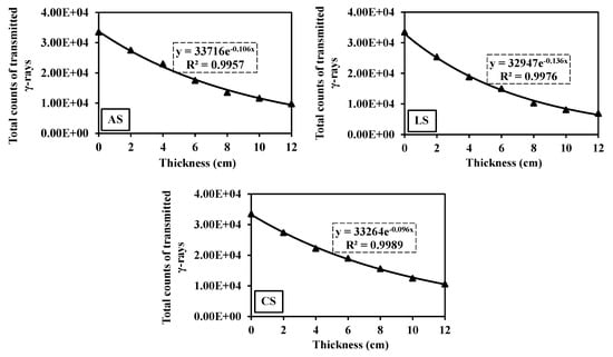 - It was found that the radiation shielding behaviour followed the following order: LS > AS > CS, against both fast neutrons and γ-rays. This was correlated with the measured radiation attenuation parameters of fast neutrons and γ-rays, involving µ (cm−1), Σ (cm−1), MFP (cm), and HVL (cm).