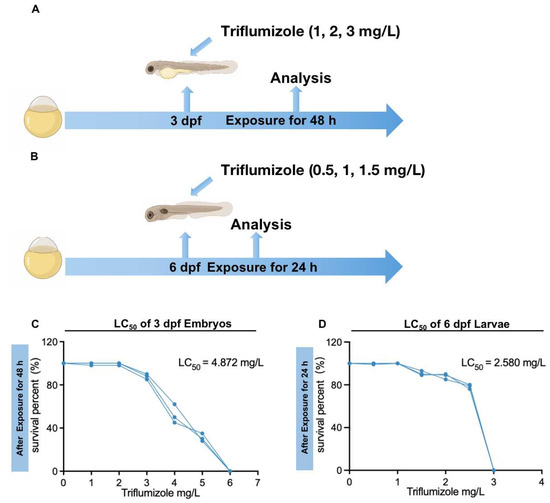 Exposure patterns and the survival percentage of zebrafish after triflumizole exposure. (A) Three dpf embryos were exposed to 1, 2, and 3 mg/L triflumizole for 48 h, (B) Six dpf larvae were exposed to 0.5, 1, and 1.5 mg/L triflumizole for 24 h. (C) The percentage of survival of 3 dpf embryos after triflumizole exposure for 48 h. (D) The percentage of survival of 6 dpf larvae after triflumizole exposure for 24 h. dpf: d post-fertilization; LC50: lethal concentration 50.