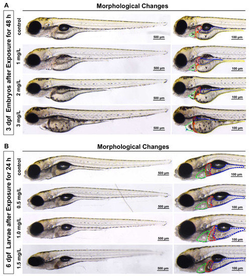 Effects of development after triflumizole exposure in zebrafish. (A) 3 dpf zebrafish embryos with morphological changes after triflumizole exposure for 48 h. (B) 6 dpf zebrafish larvae with liver degeneration after triflumizole exposure for 24 h. Blue arrows and red arrows indicate pericardial edema and liver degeneration, respectively. H: heart, the green dotted line; L: liver, the red dotted line; I: intestine, the blue dotted line; Y: yolk sac, the yellow dotted line. Scale bars = 500 μm; Scale bars = 100 μm.