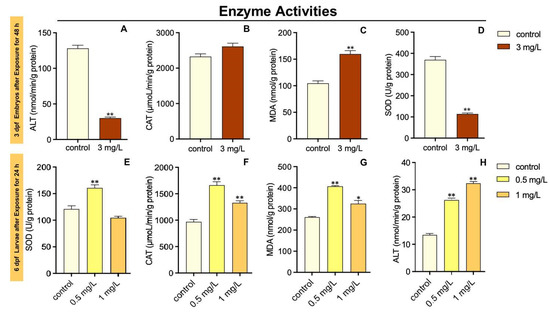 Effects of triflumizole on enzyme activities in zebrafish. For 3 dpf zebrafish embryos, SOD activity (A), CAT activity (B), MDA content (C), and ALT activity (D) after triflumizole exposure for 48 h. For 6 dpf zebrafish larvae, SOD activity (E), CAT activity (F), MDA content (G), and ALT activity (H) after triflumizole exposure for 24 h. Data are expressed as the mean of three replicates ± standard error (SEM). Asterisks denote significant differences between the control group and TFZ groups (determined by Dunnett post hoc comparison, * p < 0.05, ** p < 0.01). SOD: superoxide dismutase; CAT: catalase; MDA: malondialdehyde; ALT: alanine transaminase.