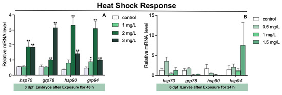 The expression of heat shock response genes (including hsp70, grp78, hsp90, and grp94) in zebrafish. (A) For 3 dpf zebrafish embryos, the expression of hsp70, grp78, hsp90, and grp94 after triflumizole exposure for 48 h. (B) For 6 dpf zebrafish larvae, the expression of hsp70, grp78, hsp90, and grp94 after triflumizole exposure for 48 h. Data are expressed as the mean of three replicates ± standard error (SEM). Asterisks denote significant differences between the control group and TFZ groups (determined by Dunnett post hoc comparison, * p < 0.05, ** p < 0.01). hsp70: heat shock protein 70; grp78: glucose-regulated protein 78; hsp90: heat shock protein 90; grp94: glucose-regulated protein 94.