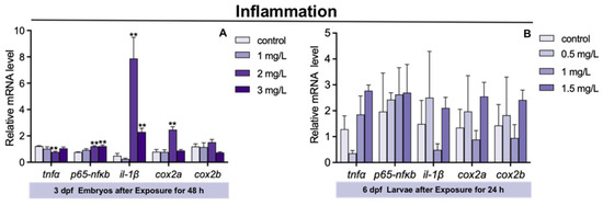 The expression of inflammatory genes (including tnfα, il-1β, p65-nfκb, cox2a, and cox2b) in zebrafish. (A) For 3 dpf zebrafish embryos, the expression of tnfα, il-1β, p65-nfκb, cox2a, and cox2b after triflumizole exposure for 48 h. (B) For 6 dpf zebrafish larvae, the expression of tnfα, il-1β, p65-nfκb, cox2a, and cox2b after triflumizole exposure for 24 h. Data are expressed as the mean of three replicates ± standard error (SEM). Asterisks denote significant differences between the control group and TFZ groups (determined by Dunnett post hoc comparison, ** p < 0.01). tnfα: tumor necrosis factor α; il-1β: interleukin 1, beta; p65-nfκb: p65-nuclear transcription factor κB; cox2a: cyclooxygenase type 2 a; cox2b: cyclooxygenase type 2 b.