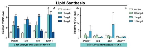 Compared to the control group, the expression of srebp1, fas, acc, and ppar-γ in 6 dpf zebrafish larvae was of no significance in the 0.5, 1, and 1.5 mg/L TFZ groups (p > 0.05, Figure 6B).