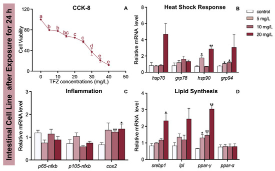 Effects of the fish intestinal cell line after triflumizole exposure for 24 h. (A) The cell viability. (B) The expression of hsp70, grp78, hsp90, and grp94 after triflumizole exposure. (C) The expression of p65-nfκb, p105-nfκb, and cox2 after triflumizole exposure. (D) The expression of srebp1, lpl, ppar-γ and ppar-α after triflumizole exposure. Data are expressed as the mean of three replicates ± standard error (SEM). Values without a common superscript letter differ (p < 0.05, Tukey’s test). Asterisks denote significant differences between the control group and TFZ groups (determined by Dunnett post hoc comparison, * p < 0.05, ** p < 0.01). Data are expressed as the mean of three replicates ± standard error (SEM). p65-nfκb: p65-nuclear transcription factor κB; p105-nfκb: p105-nuclear transcription factor κB; cox2: cyclooxygenase 2; lpl: lipoprotein lipase; ppar-α: peroxisome proliferator-activated receptor alpha.