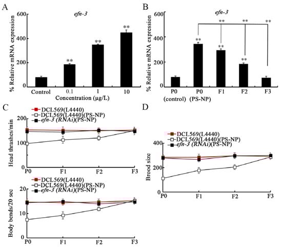 Requirement of germline Ephrin ligand EFN-3 in controlling transgenerational PS-NP toxicity. (A) Effect of PS-NP exposure on germline efn-3 expression. (B) Transgenerational expressions of germline efn-3 after PS-NP (1 μg/L) exposure. (C,D) Effect of germline RNAi of efn-3 on transgenerational toxicity of PS-NP (1 μg/L) in decreasing locomotion and in inhibiting brood size. Curves of DCL569 (L4440) (PS-NP) showed a significant difference (p < 0.01) compared to DCL569 (L4440). After the PS-NP exposure, the curves of efn-3 (RNAi) showed a significant difference (p < 0.01) compared to DCL569 (L4440). A total of 30 intact gonads were used for the qRT-PCR assay. ** p < 0.01 vs. control or P0 (control) (if not specifically indicated).