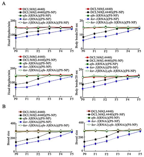 Genetic interaction between EFN-3 and KSR-1/2 in controlling transgenerational PS-NP toxicity in decreasing locomotion (A) and in reducing brood size (B). Curves of DCL569(L4440)(PS-NP) showed a significant difference (p < 0.01) compared to DCL569(L4440). After the PS-NP exposure, the curves of efn-3(RNAi), ksr-1(RNAi), and ksr-2(RNAi) showed a significant difference (p < 0.01) compared to DCL569(L4440). After the PS-NP exposure, the curves of ksr-1(RNAi)efn-3(RNAi) showed a significant difference (p < 0.01) compared to ksr-1(RNAi), and the curves of ksr-2(RNAi);efn-3(RNAi) showed a significant difference (p < 0.01) compared to ksr-2(RNAi).