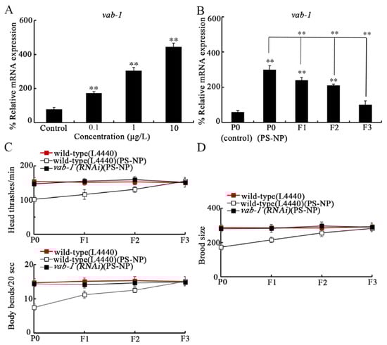 Involvement of VAB-1 in controlling transgenerational PS-NP toxicity. (A) Effect of PS-NP exposure on vab-1 expression. (B) Transgenerational expressions of vab-1 after PS-NP (1 μg/L) exposure. (C,D) Effect of RNAi of vab-1 on transgenerational PS-NP toxicity in decreasing locomotion and in inhibiting brood size. Curves of wild-type(L4440)(PS-NP) showed a significant difference (p < 0.01) compared to wild-type(L4440). After the PS-NP exposure, the curves of vab-1(RNAi) showed a significant difference (p < 0.01) compared to wild-type(L4440). ** p < 0.01 vs. control or P0(control) (if not specifically indicated).