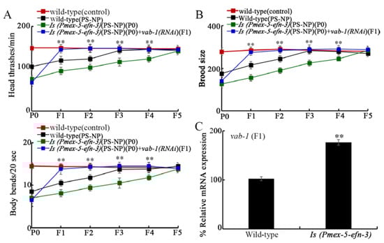 To determine the interaction between germline Ephrin ligand EFN-3 and its receptor VAB-1 in controlling transgenerational PS-NP toxicity, transgenic strain Is(Pmex-5-efn-3) overexpressing germline EFN-3 was obtained. In these Is(Pmex-5-efn-3) nematodes, the susceptibility to transgenerational PS-NP toxicity on locomotion and reproduction was observed (Figure 4A,B). After exposure of Is(Pmex-5-efn-3) nematodes to PS-NP at P0-G, RNAi of vab-1 at F1-G noticeably suppressed the formation of susceptibility to PS-NP toxicity observed in Is(Pmex-5-efn-3) nematodes from F1-G to F4-G (Figure 4A,B). Moreover, after PS-NP exposure, germline overexpression of EFN-3 significantly increased expression of vab-1 at the F1-G (Figure 4C). These observations suggest the potential transgenerational association between germline EFN-3 and its receptor VAB-1 in controlling PS-NP toxicity induction in the offspring.