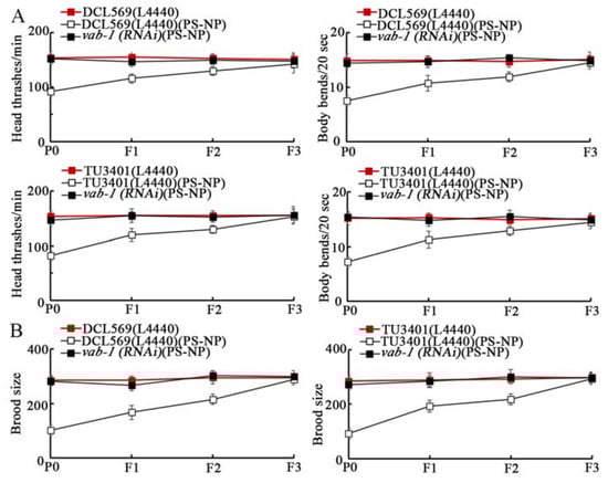 Tissue-specific activity of VAB-1 in controlling transgenerational toxicity of PS-NP (1 μg/L) in decreasing locomotion (A) and in reducing brood size (B). Curves of DCL569(L4440)(PS-NP) showed a significant difference (p < 0.01) compared to DCL569(L4440). Curves of TU3401(L4440)(PS-NP) showed a significant difference (p < 0.01) compared to TU341(L4440). After PS-NP exposure, the curves of vab-1(RNAi) showed a significant difference (p < 0.01) compared to DCL569(L4440) or TU3401(L4440).