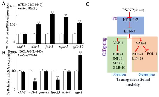 Identification of downstream targets of neuronal and germline VAB-1 in controlling PS-NP toxicity. (A) Effect of neuronal vab-1 RNAi on gene expression in 1 μg/L PS-NP-exposed nematodes. (B) Effect of germline vab-1 RNAi on gene expression in 1 μg/L PS-NP-exposed nematodes. ** p < 0.01 vs. TU3401(L4440) or DCL569(L4440). (C) A diagram showing the molecular basis for germline Ephrin signal in controlling transgenerational PS-NP toxicity in nematodes.