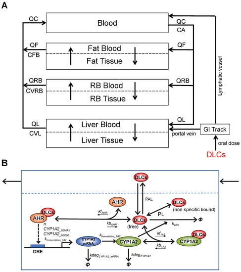 Schematic illustration of the structure and molecular key events of the DLC mixture PBPK model. (A) The overall structure of the DLC mixture PBPK model containing four blood circulation-connected compartments: Blood, Fat, RB, and Liver. The latter three are further divided into blood and tissue subcompartments to account for diffusion-limited distribution processes. (B) Details of the molecular key events in Liver Tissue: Competitive, reversible binding of DLCs for AHR (parameterized with kfAHR and kbAHR) and CYP1A2 (kf1A2 and kb1A2), transcriptional induction of CYP1A2 mRNA by DLCs-AHR complexes governed by a Hill function (n, CYP1A2_1EMAX, CYP1A2_1EC50, ktranscription_1A2), degradation of CYP1A2 mRNA (kdegCYP1A2_mRNA), protein translation of CYP1A2 (ktranslation_1A2), degradation of CYP1A2 (kdegCYP1A2), CYP1A2-mediated elimination of DLCs (kelim), and fast equilibrium between free and non-specific bound fractions of DLCs (as defined by the partition coefficients PL). Φ denotes degradation or elimination. Open arrow head: flux, solid arrow head: regulation.