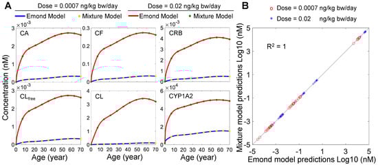 To validate the performance of our modified human mixture model for TCDD exposure only, we ran the two models (i.e., our model in Octave and the Emond model in Berkeley Madonna) for both the low-dose and high-dose lifetime exposure scenarios based on the EPA-recommended reference dose (RfD) and point-of-departure (PoD) dose []. The PoD dose, 0.02 ng/kg bw/day, was derived from the lowest-observed-adverse-effect levels (LOAEL) reported in two previous studies [,], and the RfD is 0.0007 ng/kg bw/day after applying an uncertainty factor of 30 to the PoD dose []. Our model predicts an essentially identical time-course accumulation of tissue concentrations of TCDD as the Emond model in the Blood (CA), Fat (CF), RB (CRB), and Liver (free: CLfree, total: CL) compartments as well as the induced Liver CYP1A2 levels for lifetime exposures to both doses in women (Figure 2A). When the tissue TCDD and Liver CYP1A2 concentrations at select ages (year 1, 10, 20, 30, 40, 50, 60, and 70) predicted by the two models are scatter-plotted, they fall nearly perfectly on the diagonal with R2 = 1 (Figure 2B). The result demonstrates that the behavior of our modified model implemented in Octave is basically identical to the Emond model for both low-dose and high-dose TCDD lifetime exposures. Moreover, a similar result was obtained for men (not shown), and unless otherwise specified, the remaining simulation results are presented for women.