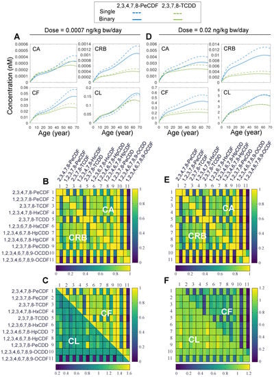 Next, we examined whether the above result that extrahepatic tissue burdens are reduced and hepatic burden is increased, obtained for the 2,3,4,7,8-PeCDF and TCDD mixture, is a general feature of binary DLC exposures. We expanded the binary mixture simulations to all other pair-wise combinations of the 11 DLC congeners for both low- (Figure 3B,C) and high-dose (Figure 3E,F) lifetime exposures. The model’s framework of vector representation of congener ODEs greatly facilitated the sweeping through all pair-wise combinations. The results indicate that the ratios of CA, CRB, and CF in a binary exposure to the counterpart concentrations in single exposures, averaged over lifetime, are always less than unity, as shown by the heatmaps in Figure 3B–F. For the low-dose exposure, the lowest ratio is 0.053 for the CA of 1,2,3,4,6,7,8,9-OCDF when it is in mixture with TCDD (Figure 3B). For the high-dose exposure, the lowest ratio is 0.03 for the CRB of 1,2,3,4,6,7,8,9-OCDF when it is in mixture with TCDD (Figure 3E). In contrast, the liver burden (CL) of a congener in a binary exposure is mostly on par with or slightly higher than that in single exposures (lower half in Figure 3C,F). For the low-dose exposure, the highest CL ratio is 1.55 for 1,2,3,7,8-PeCDD when it is in mixture with TCDD (Figure 3C). For the high-dose exposure, the highest CL ratio is 1.2, also for 1,2,3,7,8-PeCDD when it is in mixture with TCDD (Figure 3F). However, there are still cases where the liver burden is dramatically reduced when a congener is in a binary mixture. This occurs when 1,2,3,4,6,7,8,9-OCDF is in mixture with TCDD where the CL ratio is 0.24 for low-dose exposure (Figure 3C) and 0.4 for high-dose exposure (Figure 3F). In summary, binary DLC mixture exposures tend to reduce the extrahepatic tissue burdens of individual congeners while the liver burden may change in either directions depending on the binary combinations.