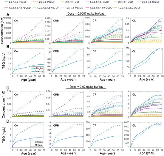 Simulation results for mixture exposure to 11 DLCs. (A) Predicted time-course of CA, CF, CRB, and CL for lifetime exposure to mixture of 11 DLCs (solid line) or single DLC (dashed line) as indicated at a dose of 0.0007 ng/kg bw/day for each congener. (B) Tissue TEQ values calculated based on the concentrations in (A) using systemic TEF. (C,D) Same as (A,B) but for high-dose exposure at 0.02 ng/kg bw/day for each congener.