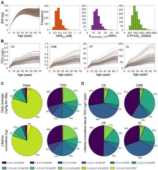 Human individuals are exposed to DLC mixtures of different compositions and levels and they are also different in physiological and biochemical parameters related to dioxin ADME, including body weight, adipose tissue fraction, AHR activation, and CYP1A2 induction [,]. In this section, we aimed to illustrate the utility of the DLC mixture PBPK model in simulating a human population and comparing the contributions of individual congeners to TEQ calculated based on different dose metrics. Monte Carlo sampling of exposures to the 11 DLC congeners is described in Methods. Each human individual is assumed to be exposed to a constant dose of a congener in ng/kg bw/day through lifetime. The variations of lifetime body weight growth and the three selected biochemical parameters are presented in Figure 5A for 1000 sampled individuals where males and females were equally represented. The simulated blood and tissue TEQ values over lifetime, calculated using systemic TEF values, are shown in Figure 5B, overlaid with the population mean and 2.5 and 97.5 percentile levels. The distribution of the daily average mass dose of the 11 congeners is presented in Figure 5C (top-left panel), where OCDD contributes to 75% of the total dose followed by 1,2,3,4,6,7,8-HpCDD at 10%, OCDF at 4%, and 1,2,3,4,6,7,8-HpCDF at 3%, while the remaining congeners are negligible. When the lifetime cumulative dose of each congener in each individual is calculated, the distribution is basically identical to the daily average dose (Figure 5C, bottom-left panel). Next, we compared the contributions of individual congeners to intake TEQ. The contributions of individual congeners to daily (Figure 5C, top-right panel) or cumulative (Figure 5C, bottom-right panel) intake TEQ are markedly different than their mass dose compositions. Here, 2,3,4,7,8-PeCDF contributes the most, at 29%, followed by 1,2,3,7,8-PeCDD at 20%, TCDD at 15%, 1,2,3,4,7,8-HxCDF at 11%, 2,3,7,8-TCDF at 8%, and both 1,2,3,6,7,8-HxCDF and 1,2,3,4,6,7,8-HpCDD at 6%, while the remaining congeners are negligible.
