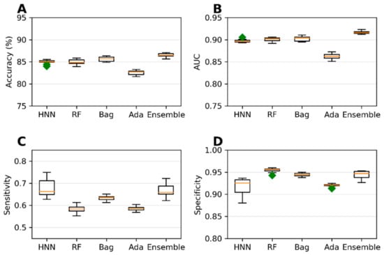 (A) Accuracy, (B) AUC, (C) sensitivity, and (D) specificity for the ChemIDplus IP/IV/Sub/Oral data as given by HNN, RF, Bagging, AdaBoost, and the Ensemble methods.
