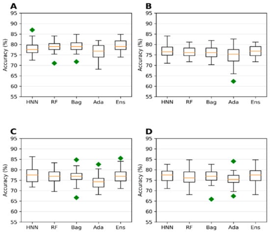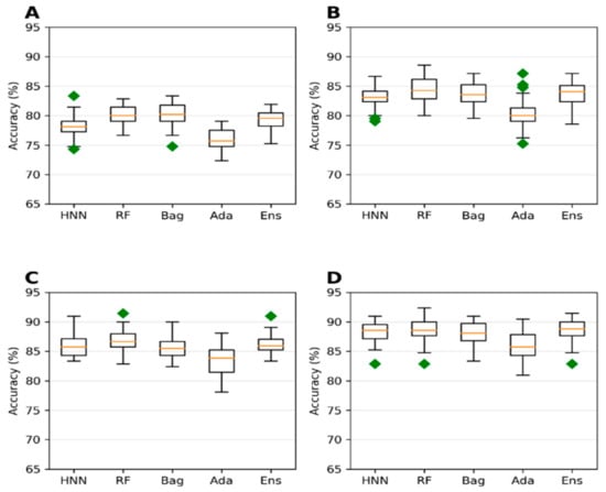 Accuracy for the combined data (toxin data from T3DB + animal toxicity data from EPA) with cutoffs at (A) 250 mg/kg, (B) 500 mg/kg, (C) 750 mg/kg, and (D) 1000 mg/kg by HNN, RF, Bagging, AdaBoost, and the Ensemble methods.
