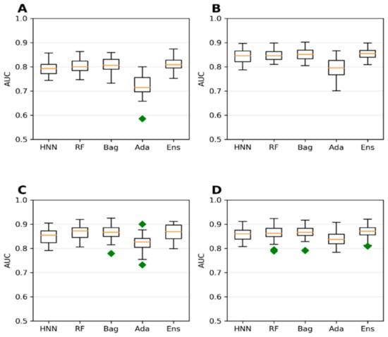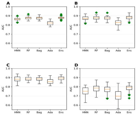 The AUC for toxins LD50 data obtained via oral route of exposure with various cutoffs at (A) 250 mg/kg, (B) 500 mg/kg, (C) 750 mg/kg, and (D) 1000 mg/kg by HNN, RF, Bagging, AdaBoost, and the Ensemble methods.
