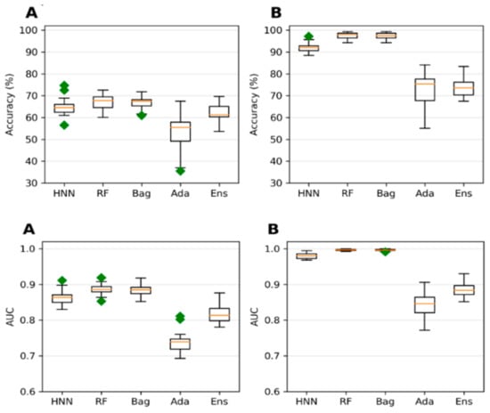 Accuracy and AUC for the multiclass classification (A) toxins Oral data and (B) toxins oral data + Oversampling by HNN, RF, Bagging, AdaBoost, and the Ensemble method.