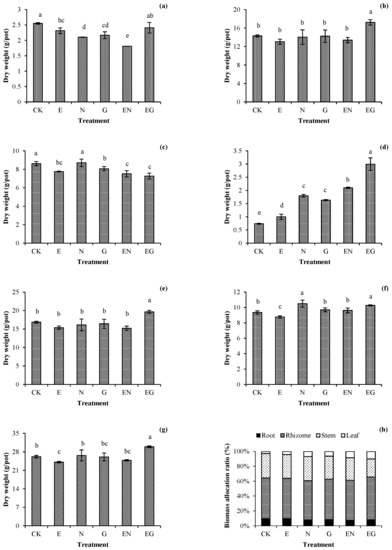 Effects of the different treatments on the (a) root, (b) rhizome, (c) stem, (d) leaf, (e) underground part, (f) aerial part, (g) total dry weight, and (h) biomass allocation ratio of dwarf bamboo. Error bars represent the standard deviations (SDs) of the means (n = 3). According to Duncan’s multiple range test, different letters above the bars indicate significant differences (p < 0.05).