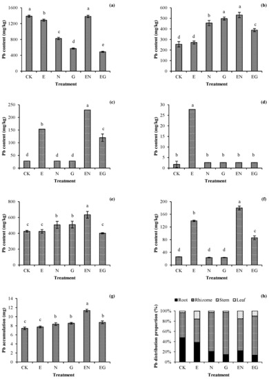 Figure 2 shows the effect of different treatments on the Pb level in plants. There was no significant increase in the Pb content in the plant roots in all treatments as compared with CK (Figure 2a). The Pb content of the rhizomes in all treatments increased significantly except for plants in the E treatment, with the EN treatment having the highest increase (2.09 times that of CK, Figure 2b). Plants in the N and G treatments did not have any further increase in the Pb content in the aerial plant parts. The Pb content in their stems and leaves was not significantly different from those of CK. Plants in the E, EN, and EG treatments had a significant increase in the Pb content in the stems, with those in the EN treatment having the highest increase (8.24 times that of CK, Figure 2c). Of note, only the E treatment significantly increased the Pb content in plant leaves (Figure 2d).