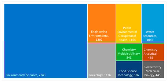 The Web of Science (WOS) database is one of the largest abstract and citation databases, and it was used to conduct the literature search. Using the following search parameters (TS = (heavy metal) AND TS = (human health)), 13,198 documents were identified. These documents are classified into the categories presented in Figure 3 (one document can fall into multiple categories).