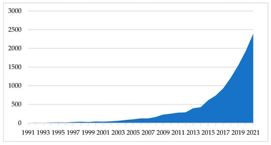 Figure 3 presents the number of articles published each year. Due to the low number of published articles before 1991, Figure 4 presents only the data from 1991 to 2021. The first year in which there were over 100 articles published was 2006.