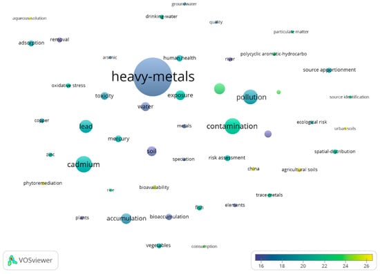 A total of 11,593 documents were published in this period. Out of these documents, 9749 (85.01%) were articles, 1461 (12.60%) were review papers, and 469 (4.04%) were proceedings papers. The rest were classified into other categories. China was the most productive country, followed by the United States, India, Pakistan, and Iran. Figure 6 (52 items) shows the keywords co-occurrence map for this period. The minimum word occurrence was set to 300.