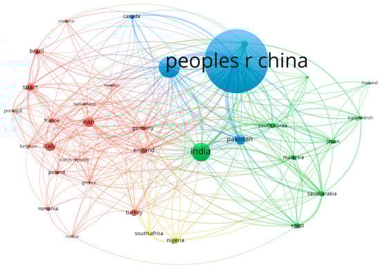VOS viewer was used to create the network map of country co-authorship (Figure 7). Countries that collaborated in writing articles were grouped in clusters. The bubble size is directly proportional to the number of published documents, and the thickness of the line is directly proportional to the link strength (a measure of co-authorship between two countries). The bubble color indicates the clusters.