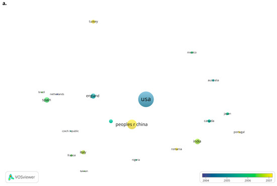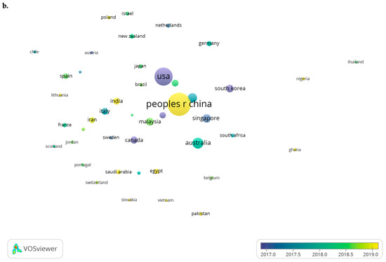 Furthermore, a bubble map representing the top-20 countries was created based on the number of documents to compare the two periods (Figure 8a,b). The bubble color indicates the average publication year of a country, and the bubble size is directly proportional to the number of published documents. Two bubbles are in closer proximity to each other if they collaborate often. For the first period, the United States was the major contributor in this field, but China overtook the United States in the second period regarding the number of published articles.