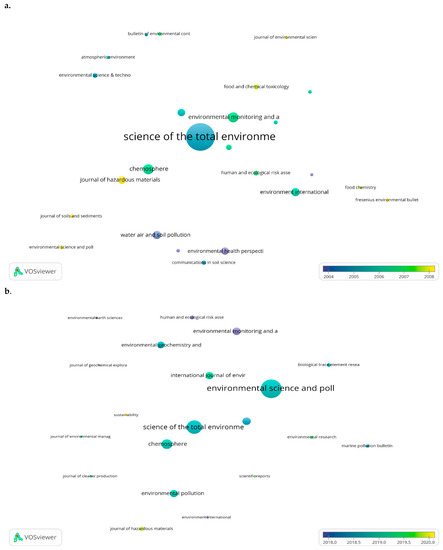 VOSviewer was used to create a bubble map of the sources that published the most documents in each period (Figure 9). The bubble size is directly proportional to the number of published documents. The bubble color represents the average publication year. For the 1975–2010 period, the most prolific journal was Science of the Total Environment, with an average publication year of 2004.82, followed by Chemosphere with an average publication year of 2006.62, and Environmental Monitoring and Assessment with an average publication year of 2006.78. The most prolific journal in the second period was Environmental Science and Pollution Research with an average publication year of 2018.78.