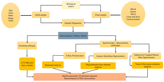 Framing the already-published information in the literature on the topic (depicted in the bibliometric analysis), this paper aims to provide updated knowledge and a documented and validated database on the recognized toxicity of HMs, the harmful effects of their accumulation on human health, the benefits vs. disadvantages of choosing different biological fluids/tissues/organs for the identification and quantitative measurement of HMs in the human body, as well as on the choice of the optimal method of HMs analysis, depending on the purpose.