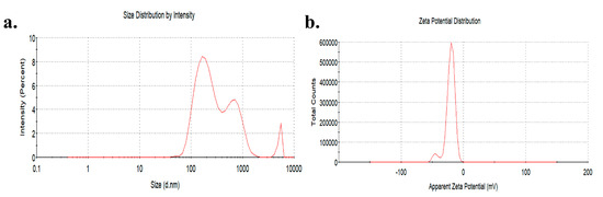 Distribution of hydration particle size (a) and zeta potential (b) of TiO2 NPs in a serum-free medium.