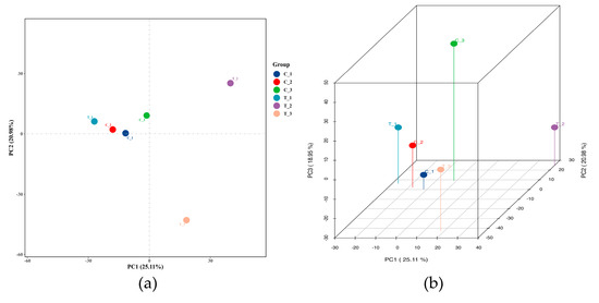 lncRNA expression analysis of TiO2 NPs with a concentration of 0 and 100 μg/mL. Princi-pal component analysis (PCA) 2D (a) and 3D (b) plots were drawn based on the expression of trusted lncRNAs to compare the difference between the control and the treatment groups.