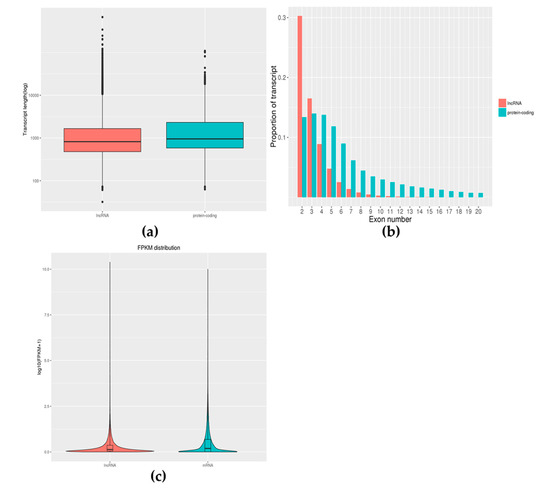 The length of the lncRNAs was between 32 and 674,512 bp and the median length was 821 bp. As shown in Figure 4a, lncRNA was slightly shorter than the mRNA (median length is 953 bp). Approximately 30.3% of lncRNAs contained two exons, while mRNAs contained several exons from 1 to 363 (Figure 4b). Expression-level analysis showed that the overall expression level of lncRNA was slightly lower than the expression level of mRNA (mean 0.31:0.52, Figure 4c).