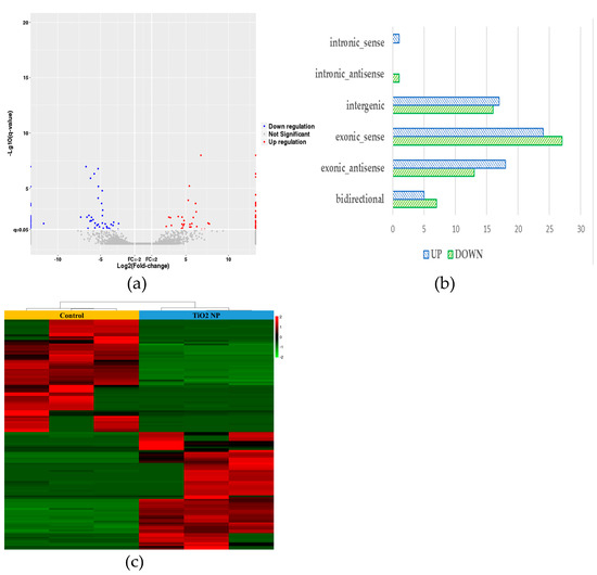 lncRNA differential expression analysis of TiO2 NPs with concentrations of 0 and 100 μg/mL. A volcanic map of differentially expressed genes in the treatment group showed the number of up-regulated and down-regulated genes (a). The histogram of the relative expression of differential lncRNAs was drawn and showed that the lncRNAs belonging to the exonic-sense class counts had the highest proportion (b). A heat map of cluster analysis between the treatment group and control group demonstrated their characteristic difference (c).