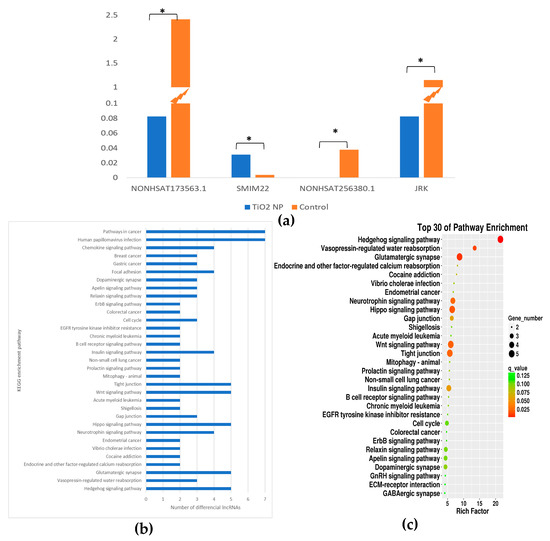 Pathway analysis of TiO2 NPs with concentrations of 0 and 100 μg/mL. A bar graph of differential lncRNAs numbers in different pathways of KEGG was drawn (a). A KEGG enrichment analysis bubble plot was drawn in the descending order of q value corresponding to each entry in the TiO2 NP treatment group (b). The relative content of the two lncRNAs and corresponding mRNAs in the TiO2 NP treatment and the control group was drawn in a histogram (* p < 0.05) (c).