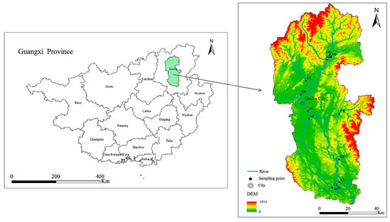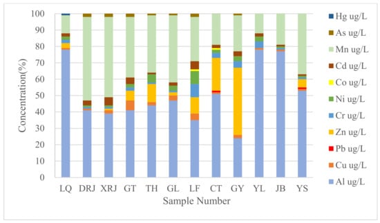 - Huang, H.W.; Xiao, H.; Wang, D.Q.; Xin, B.D.; Sun, X.J.; Li, J.Y.; Li, X.K. Pollution characteristics and health risk assessment of heavy metals in the water of Lijiang River Basin. Environ. Sci. 2021, 42, 1714–1723. (In Chinese) [Google Scholar] [CrossRef]