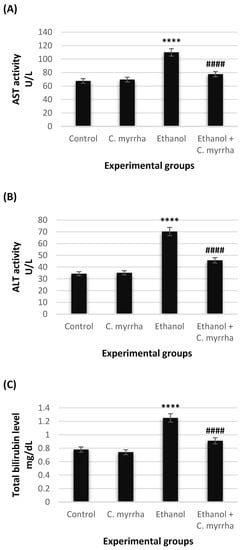 Effects of C. myrrha extract (500 mg/kg) and/or ethanol (40%, 3 g/kg) intake on the liver function parameters in serum after 30 days of treatment. (A) Aspartate transaminase (AST) activity expressed as units per liter (U/L). (B) Alanine transaminase (ALT) activity expressed as units per liter (U/L). (C) Total bilirubin level is expressed as milligrams per deciliter (mg/dL). All values are expressed as mean ± standard error (SE) of n = 7. **** p < 0.0001 vs. control; #### p < 0.0001 vs. ethanol-treated group.