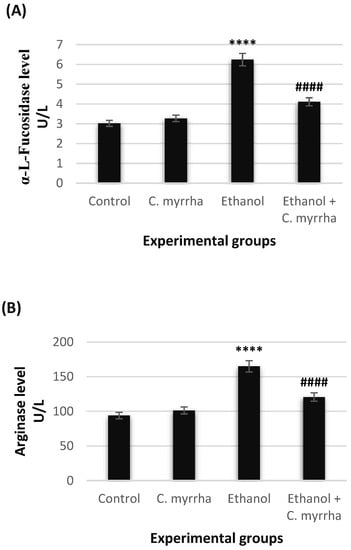 Serum α-L-flucosidase and arginase levels significantly increased (p < 0.0001) in group 3, which received 40% ethanol only (6.24 ± 0.39 and 164.95 ± 5.05 U/L, respectively) compared with group 1 (control) (3.02 ± 0.20 and 93.86 ± 4.17 U/L, respectively). However, coadministration with C. myrrha extract in group 4 significantly decreased (p < 0.0001) both marker levels in the serum to 4.11 ± 0.33 and 120.58 ± 4.21 U/L, respectively. When C. myrrha extract was used alone in group 2, we observed no significant changes in either α-L-flucosidase or arginase levels (3.27 ± 0.33 and 101.27 ± 4.07 U/L, respectively) compared with the control (Figure 2).