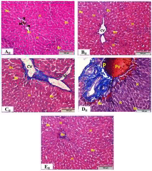II. Representative images of Masson’s trichrome staining sections for liver tissues of control and experimental groups. (AII,BII): The hepatic tissues of control and C. myrrha extract-treated rats; respectively; showed a normal distribution of collagen fibers (blue) in sinusoidal spaces (Bs), around the central vein (Cv) which was bounded by an intact endothelium (arrowheads), and between parallel cords of hepatocytes (H). (CII,DII): The hepatic tissue of ethanol-treated rats showed a high deposition of collagen fibers (blue) around the central vein (Cv), dilation and congestion of portal vein (Pv) with portal spaces (P) expanded by abundant fibrous tissues (blue) as a marker for severe periportal fibrosis. (EII): Group treated with C. myrrha extract + ethanol showed noticeably reduced periportal fibrosis (blue). (200×, scale bar 100 µm).