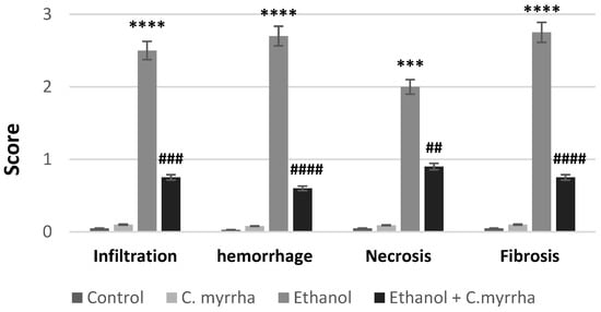 Semi-quantitative histopathological evaluation of the hepatic tissues from all experimental groups illustrating severity scores of lymphocyte infiltration, hemorrhage, necrosis, and fibrosis for experimental groups. *** p < 0.001; **** p < 0.0001 vs. control; ## p < 0.01; ### p < 0.001; #### p < 0.0001 vs. ethanol-treated group.