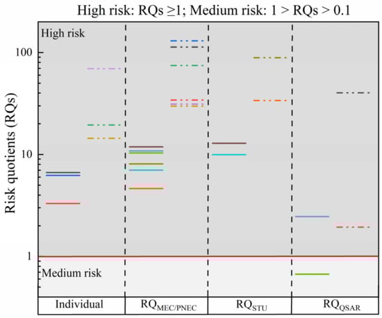 The second method is a computational evaluation based on the toxicity of mixture and is known as RQSTU (STU, the sum of toxic units). As shown in Equation (9), the RQSTU value is usually calculated using three trophic levels (algae, Daphnia and fish). In brief, the highest MEC and EC50 were used to calculate the STU for each trophic level, after which the maximum STU value was selected and multiplied by AF (1000):