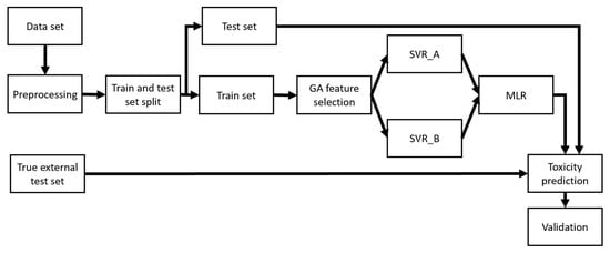 For the construction and subsequent evaluation of QSAR models, the data were randomly divided into training and test sets in a ratio of 9:1. This ratio was chosen after experimenting with different training/test split ratios (3:1, 4:1, …, 9:1), and resulted in the best model performance and the least number of descriptors. In the preliminary phase, six structures were identified as outliers and removed from the training set. In the current study, the correlation between activity and structural descriptors was developed using the Genetic Algorithm (GA) for variable selection and Support Vector Regression (SVR) methods. As a result, GA-SVR was used for a preliminary model selection. The GA variable selection started with a population of 150 random models and 2000 iterations for evolution, with the mutation probability set to 20%. Some researchers have advocated combining learners in different methods, and their results have shown that they perform better than a single candidate learner [,]. In this context, after developing SVR models, two SVRs that had the best statistical parameters and robustness were used to create a hierarchical ensemble and develop a QSAR model which has substantially better performance than any single one in the hierarchy—as demonstrated previously []. According to the same study, a MLR model was used to refine the output of the baseline SVRs and build the ensemble model. The hierarchy of this method is shown in Figure 1.