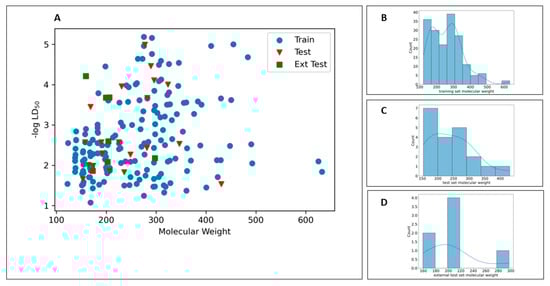 (A) Scatter plots of −logLD50 values vs. molecular weight. Histogram of molecular weights for (B) training set, (C) test set, (D) external test set.
