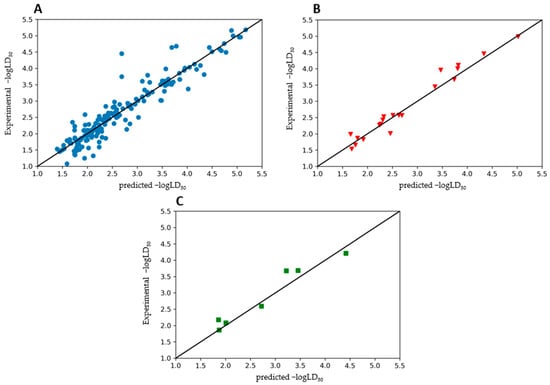 Experimental versus predicted −logLD50 values obtained by the ensemble model for the training (A), test (B) and external test (C) sets.