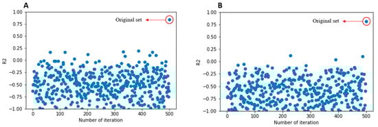 We selected the best model based on the above parameters for both the training set and the test set to avoid overfitting. It is worth noting that selecting a smaller number of descriptors in the model was also considered an important parameter to reduce the complexity of the model and the computational cost. To confirm that the selected model is not close to random, the Y-scrambling test [] was performed. In this method, the target variable is randomly shuffled to produce a dummy dataset. Therefore, there should be no correlation between the selected descriptors and the new target variable. As a result, the performance of the scrambled models should drop significantly []. The performance of the models is measured by their R2.